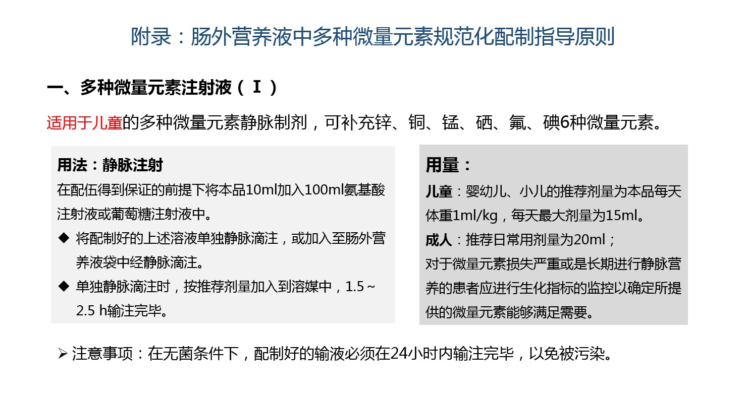 3、鉴于新生儿和儿童肠外营养用药的特殊性和安全性考虑,临床应使用婴幼儿和儿童专用的微量元素补充制剂。